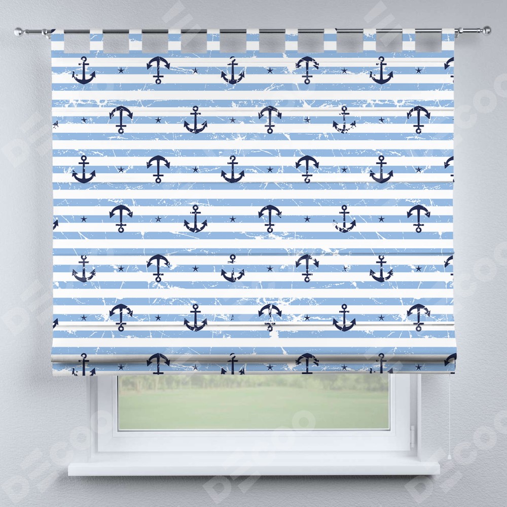 Римская штора производителя «Cortin», используется для проёма, пошита из ткани блэкаут с нанесением сублимационной печати «Полоски и якори». Данная модель пошита на петлях, комплектуется на выбор круглым карнизом и подходит для монтажа на стену. Римская штора на петлях имеет простую систему регулировки высоты, отличительным преимуществом данной модели является простой способ монтажа. Достаточно повесить ее на трубу и штора готова!