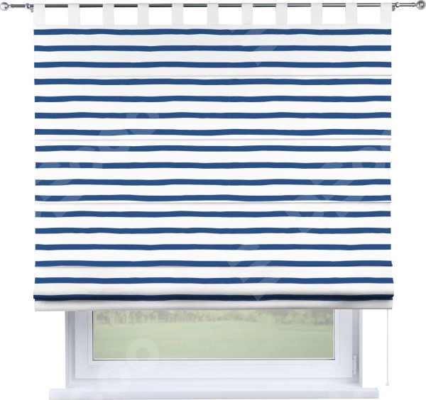 Римская штора производителя «Cortin», используется для проёма, пошита из ткани блэкаут с нанесением сублимационной печати «Морская полоска». Данная модель пошита на петлях, комплектуется на выбор круглым карнизом и подходит для монтажа на стену. Римская штора на петлях имеет простую систему регулировки высоты, отличительным преимуществом данной модели является простой способ монтажа. Достаточно повесить ее на трубу и штора готова!