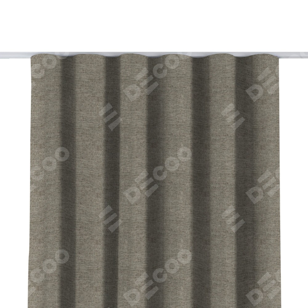 Комплект прямых штор, от производителя «Cortin», пошиты из ткани стиф димаут серо-коричневый, артикул ткани 44028. С изнаночной стороны в верхней части штор пристрачивается шторная лента с декоративными складками «Волна». Для создания элегантных складок прямые шторы шьются по стандарту с коэффициентом 1:2 (на 100 см. ширины проёма 200 см. ширины ткани).