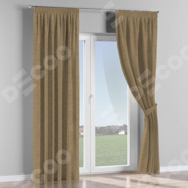 Комплект прямых штор, от производителя «Cortin», пошиты из ткани стиф димаут тёмно-бежевый, артикул ткани 18085. С изнаночной стороны в верхней части штор пристрачивается шторная лента с декоративными складками «Карандаш». Для создания элегантных складок прямые шторы шьются по стандарту с коэффициентом 1:2 (на 100 см. ширины проёма 200 см. ширины ткани).