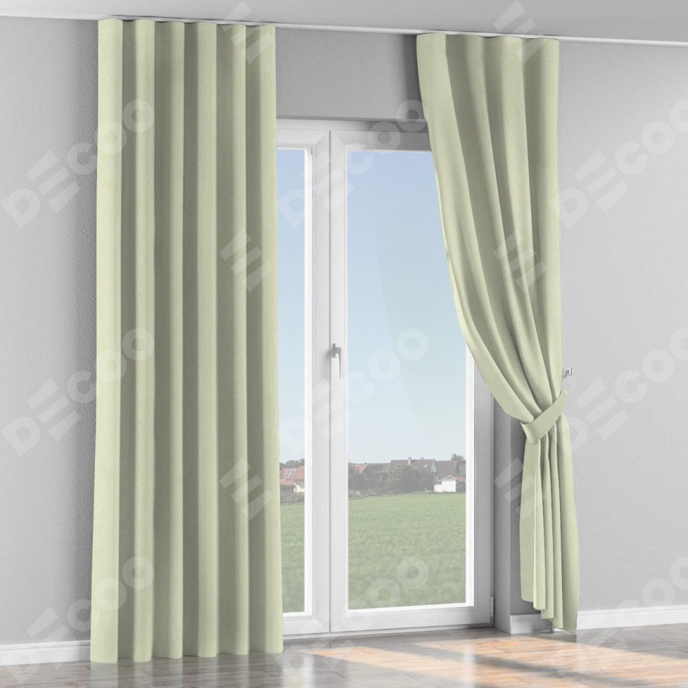 Комплект прямых штор, от производителя «Cortin», пошиты из ткани блэкаут однотонный сливочный, артикул ткани 6668−02. С изнаночной стороны в верхней части штор пристрачивается шторная лента с декоративными складками «Волна». Для создания элегантных складок прямые шторы шьются по стандарту с коэффициентом 1:2 (на 100 см. ширины проёма 200 см. ширины ткани).