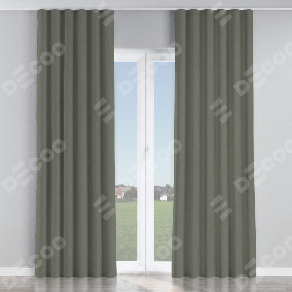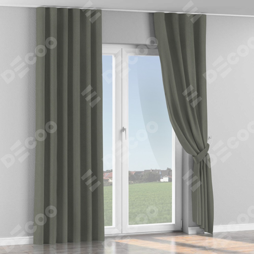 Комплект прямых штор, от производителя «Cortin», пошиты из ткани блэкаут однотонный тёмно-серый, артикул ткани 29332−1. С изнаночной стороны в верхней части штор пристрачивается шторная лента с декоративными складками «Волна». Для создания элегантных складок прямые шторы шьются по стандарту с коэффициентом 1:2 (на 100 см. ширины проёма 200 см. ширины ткани).