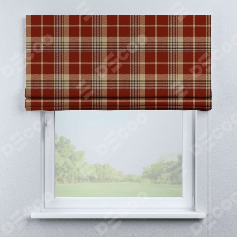 Римская штора производителя «Cortin», используется для проёма, пошита из ткани блэкаут с нанесением сублимационной печати «Бежево-бордовая клетка». Имеет универсальный механизм и подходит для монтажа: на потолок, на стену и в нишу.