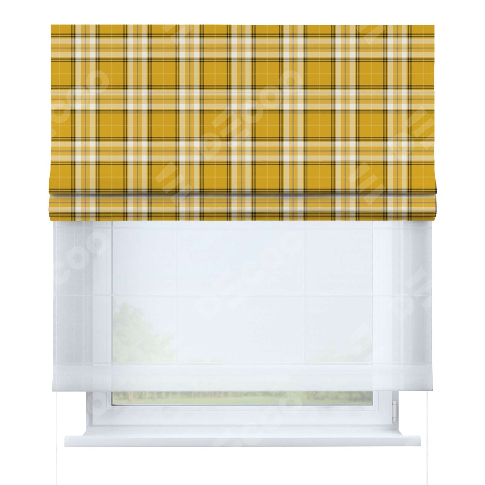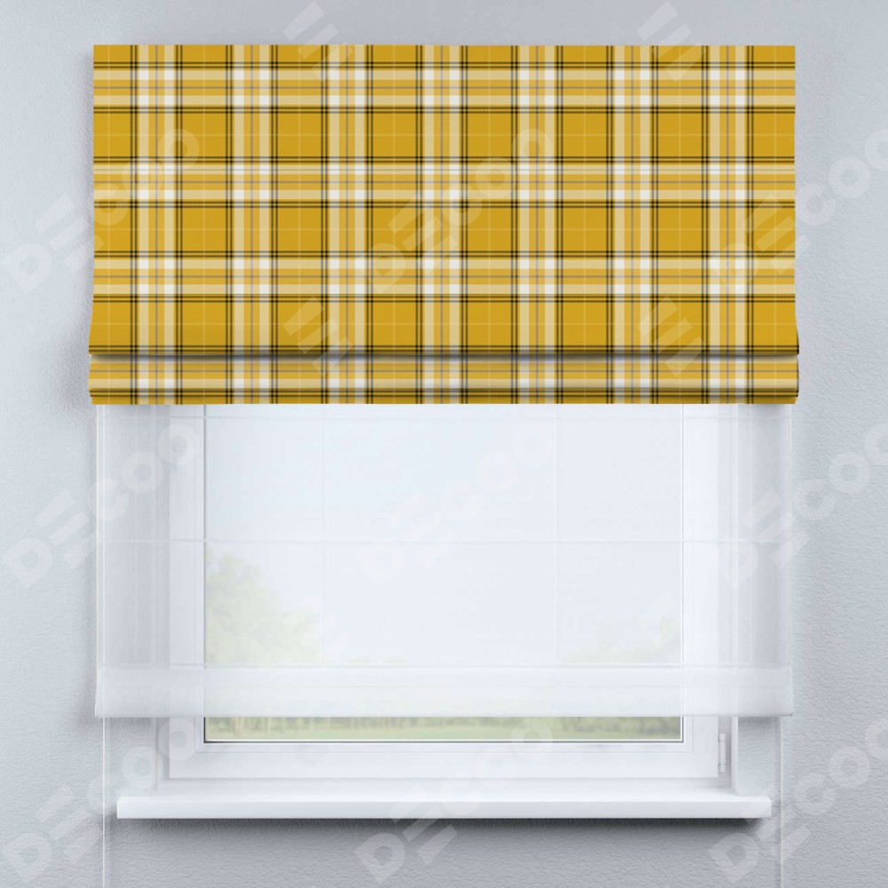 Римская штора день-ночь производителя «Cortin», используется для проёма, пошита из двух полотен, с лицевой блэкаут с нанесением сублимационной печати «Желто-горчичная клетка», вторая ткань тюль (по стандарту комплектуется тюль белого цвета артикул V-01). Имеет универсальный механизм и подходит для монтажа: на потолок, на стену и в нишу.