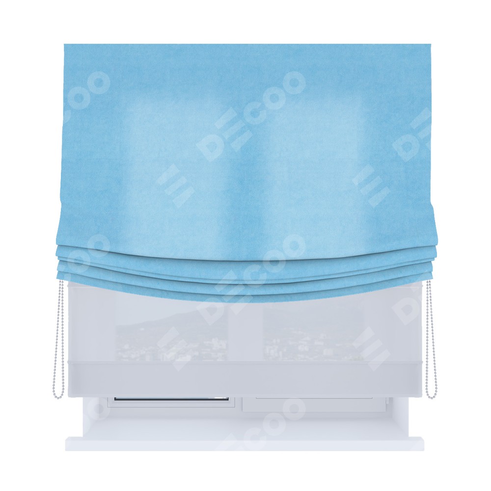 Римская штора день-ночь производителя «Cortin», используется для проёма, пошита из двух полотен, с лицевой стороны вельвет голубой артикул 85544, вторая ткань тюль (по стандарту комплектуется тюль белого цвета артикул V-01). Имеет универсальный механизм и подходит для монтажа: на потолок, на стену и в нишу. Удобное управление каждой шторой отдельно.