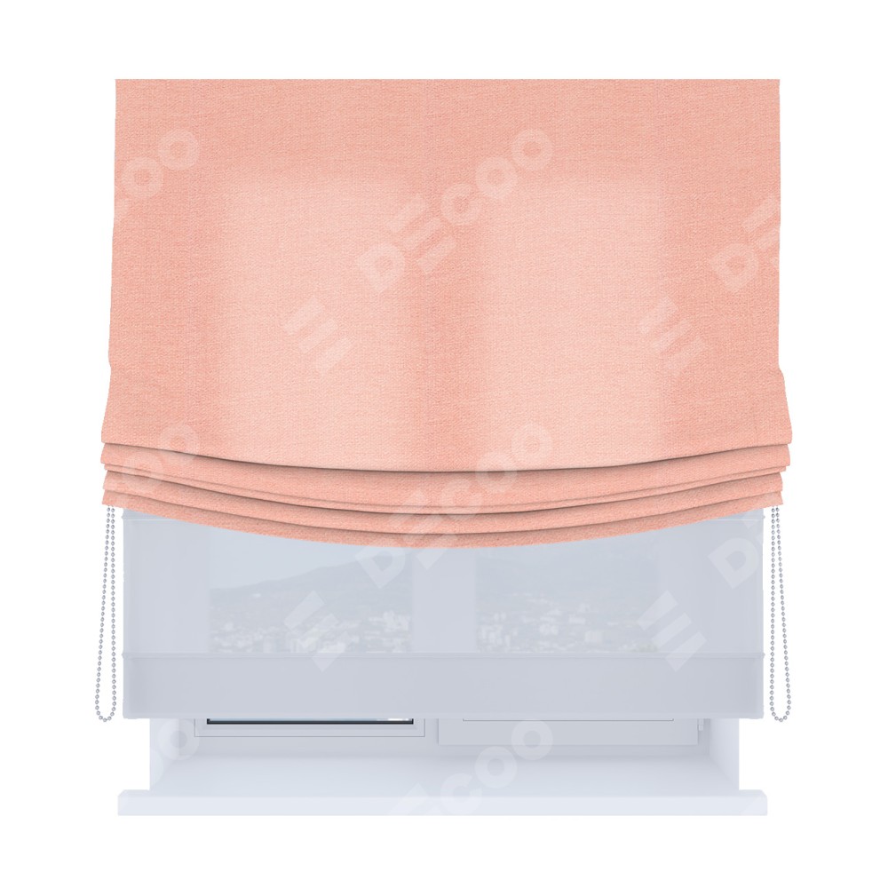 Римская штора день-ночь (двойная) от производителя «Cortin», используется для проёма. Пошита из двух полотен, основная ткань лён розовый артикул 00005, вторая ткань тюль (по стандарту используется тюль белого цвета артикул V-01). Имеет универсальный механизм и подходит для монтажа: на потолок, на стену и в нишу. Удобное управление каждой шторой отдельно.