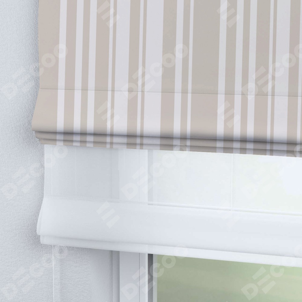 Римская штора день-ночь производителя «Cortin», используется для проёма, пошита из двух полотен, с лицевой блэкаут с нанесением сублимационной печати «Бежевые вертикальные полоски», вторая ткань тюль (по стандарту комплектуется тюль белого цвета артикул V-01). Имеет универсальный механизм и подходит для монтажа: на потолок, на стену и в нишу.