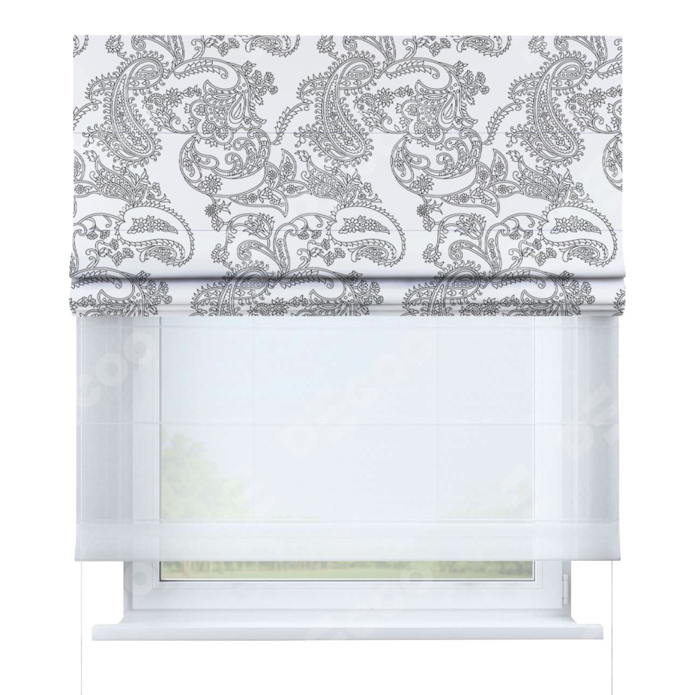 Римская штора день-ночь производителя «Cortin», используется для проёма, пошита из двух полотен, с лицевой блэкаут с нанесением сублимационной печати «Светлый пейсли», вторая ткань тюль (по стандарту комплектуется тюль белого цвета артикул V-01). Имеет универсальный механизм и подходит для монтажа: на потолок, на стену и в нишу.