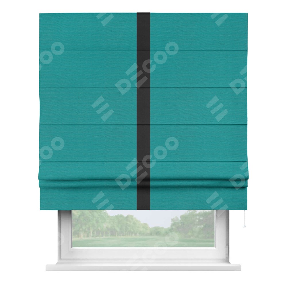 Римская штора производителя «Cortin», используется для проёма, пошита из ткани блэкаут однотонный бирюзовый, артикул ткани 88297. Отделка шторы кантом «Хайвей», ткань для канта используется из блэкаута однотонного разной расцветки на выбор. Имеет универсальный механизм и подходит для монтажа: на потолок, на стену и в нишу.