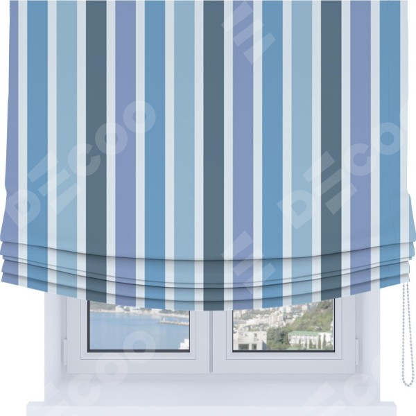 Римская штора Soft производителя «Cortin», используется для проёма, пошита из ткани блэкаут с нанесением сублимационной печати «Сине-голубые вертикальные полоски». Имеет универсальный механизм и подходит для монтажа: на потолок, на стену и в нишу. В отличие от стандартных римских штор, римская штора Soft не имеет горизонтальных вставок и нижнего отвеса. Это позволяет ткани произвольно драпироваться в свободные мягкие складки.