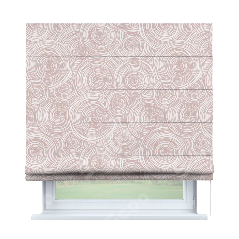 Римская штора производителя «Cortin», используется для проёма, пошита из ткани блэкаут с нанесением сублимационной печати «Бежевые круги». Имеет универсальный механизм и подходит для монтажа: на потолок, на стену и в нишу.