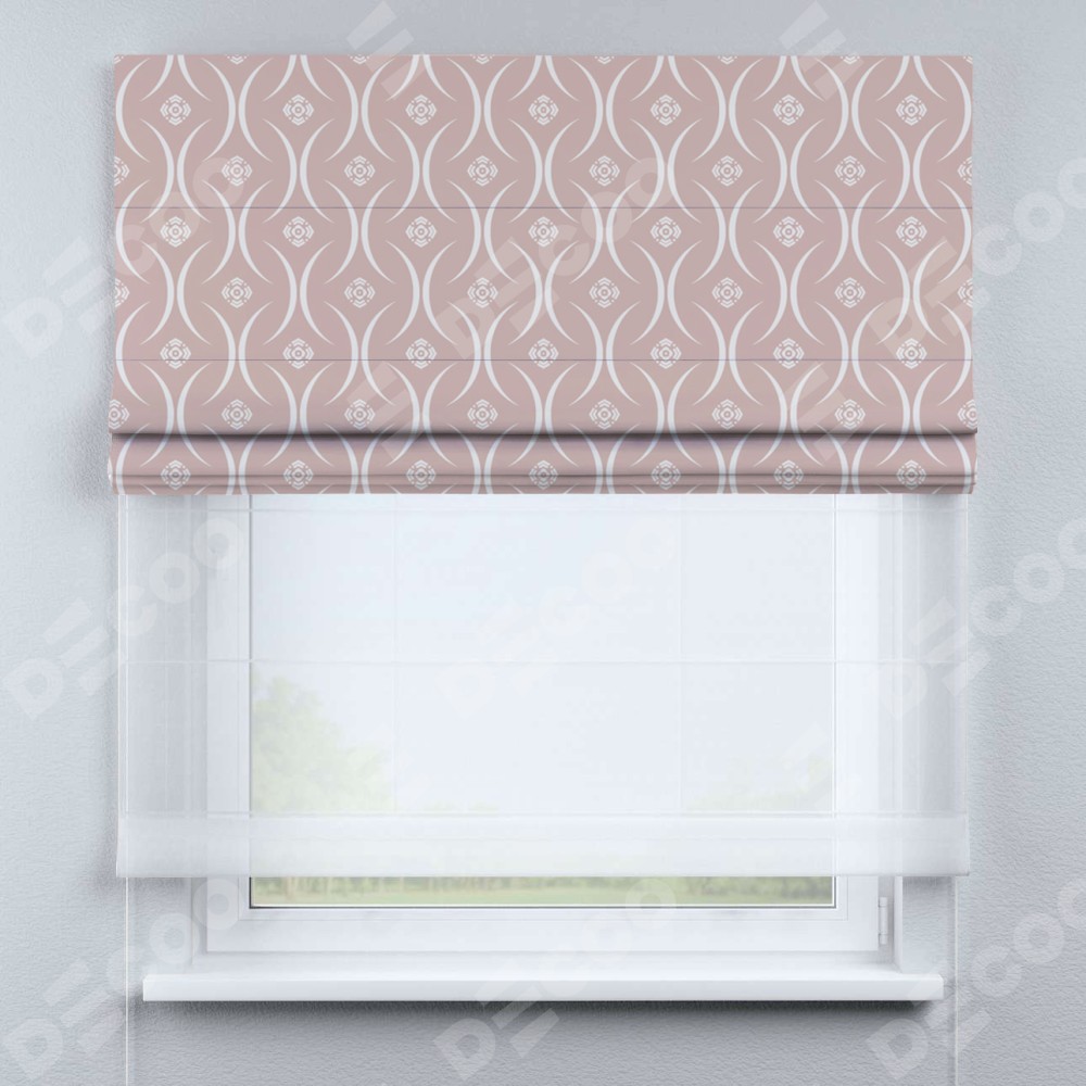 Римская штора день-ночь производителя «Cortin», используется для проёма, пошита из двух полотен, с лицевой блэкаут с нанесением сублимационной печати «Воздушный узор бежевый», вторая ткань тюль (по стандарту комплектуется тюль белого цвета артикул V-01). Имеет универсальный механизм и подходит для монтажа: на потолок, на стену и в нишу.