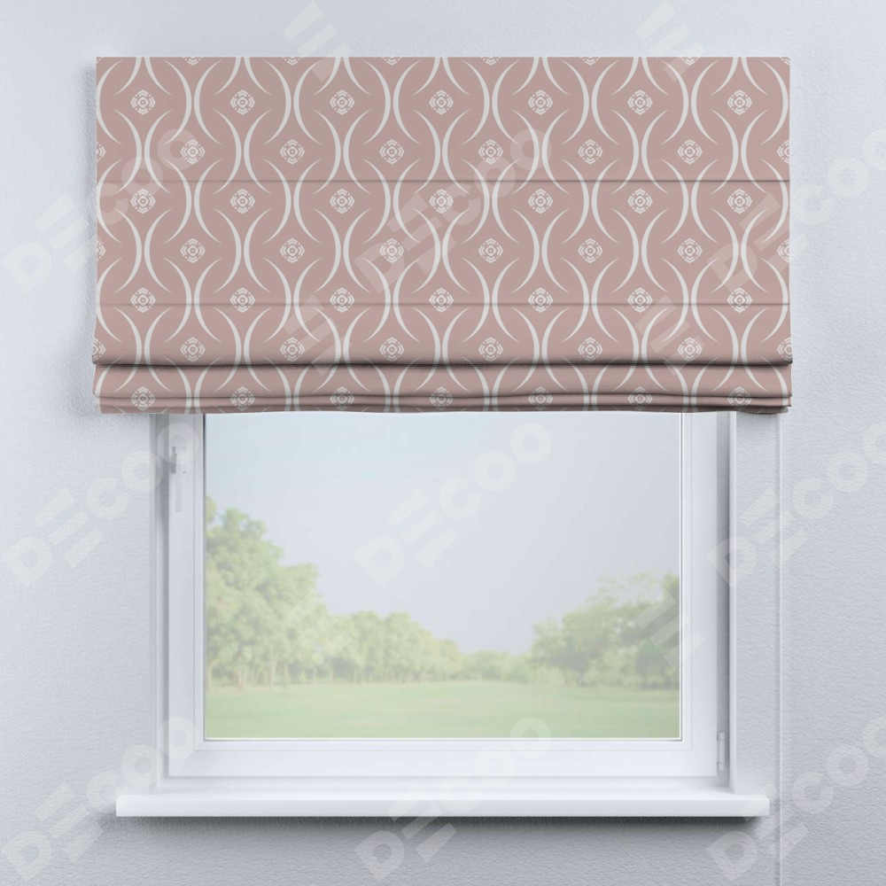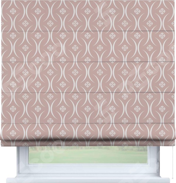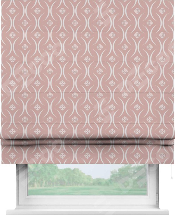 Римская штора производителя «Cortin», используется для проёма, пошита из ткани блэкаут с нанесением сублимационной печати «Воздушный узор бежевый». Имеет универсальный механизм и подходит для монтажа: на потолок, на стену и в нишу.