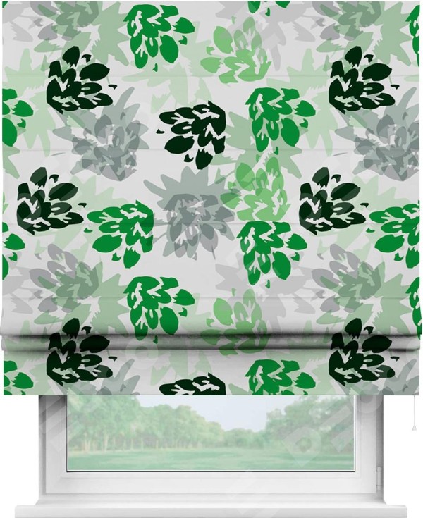 Римская штора производителя «Cortin», используется для проёма, пошита из ткани блэкаут с нанесением сублимационной печати «Зелёный луг». Имеет универсальный механизм и подходит для монтажа: на потолок, на стену и в нишу.