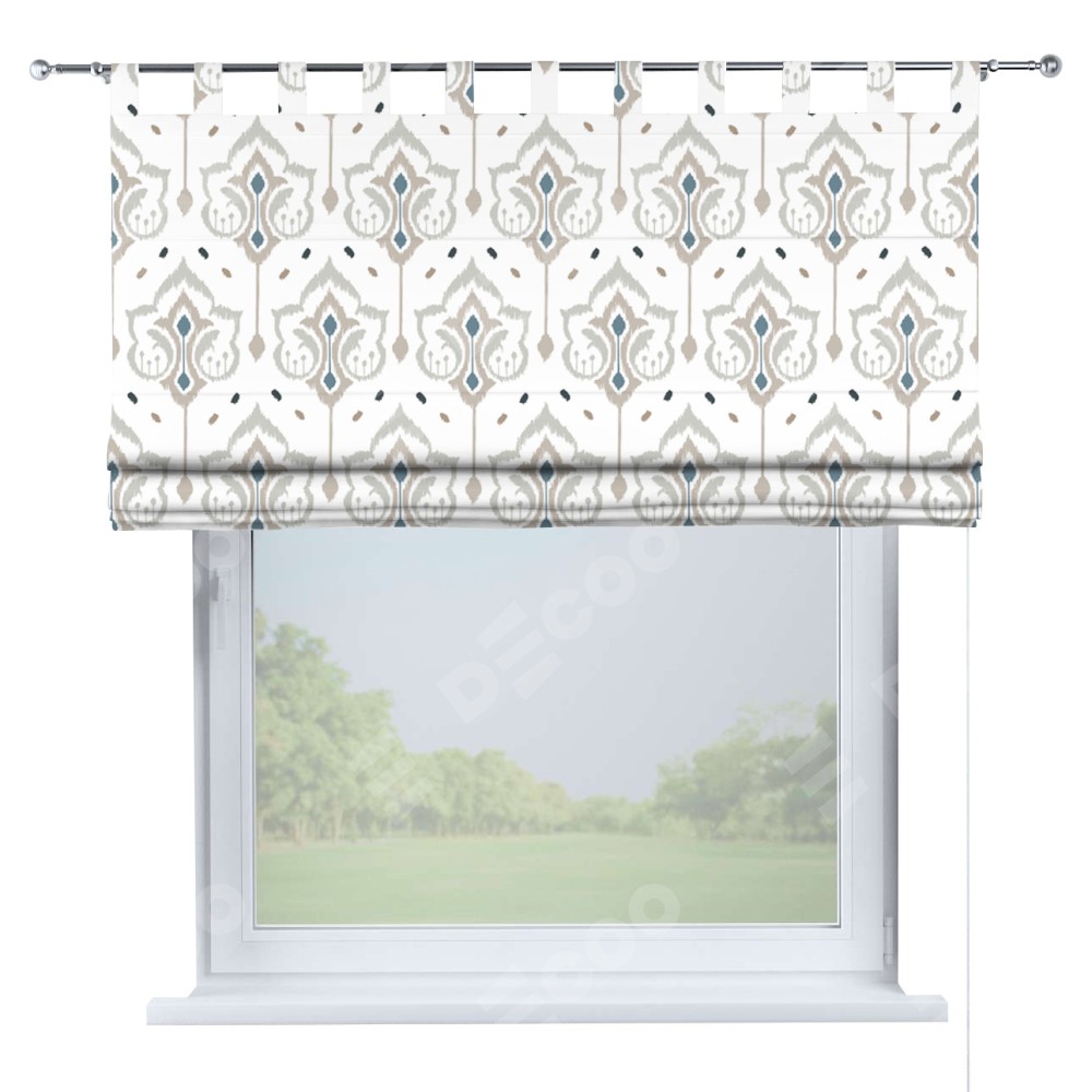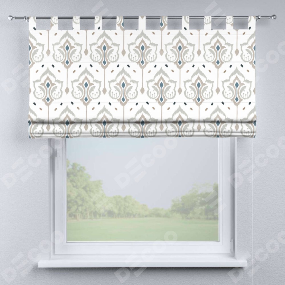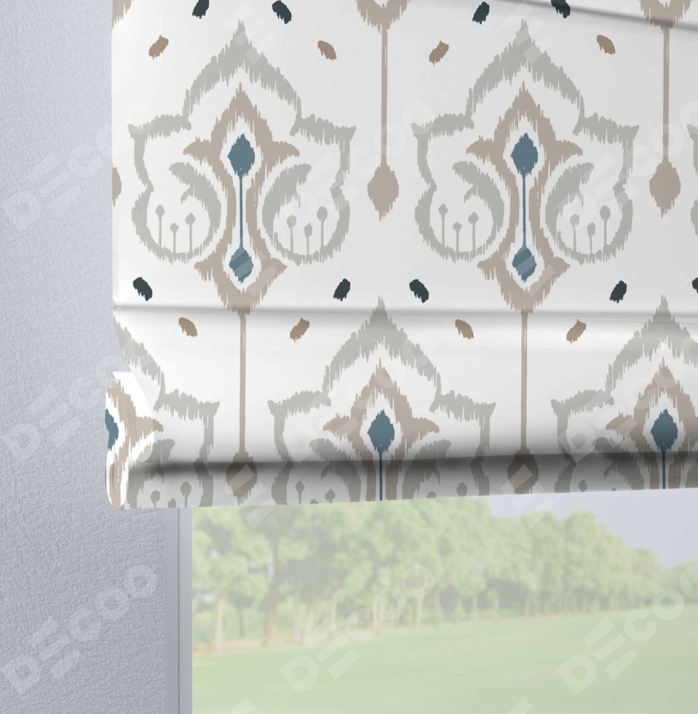 Римская штора производителя «Cortin», используется для проёма, пошита из ткани блэкаут с нанесением сублимационной печати «Икат узор». Данная модель пошита на петлях, комплектуется на выбор круглым карнизом и подходит для монтажа на стену. Римская штора на петлях имеет простую систему регулировки высоты, отличительным преимуществом данной модели является простой способ монтажа. Достаточно повесить ее на трубу и штора готова!