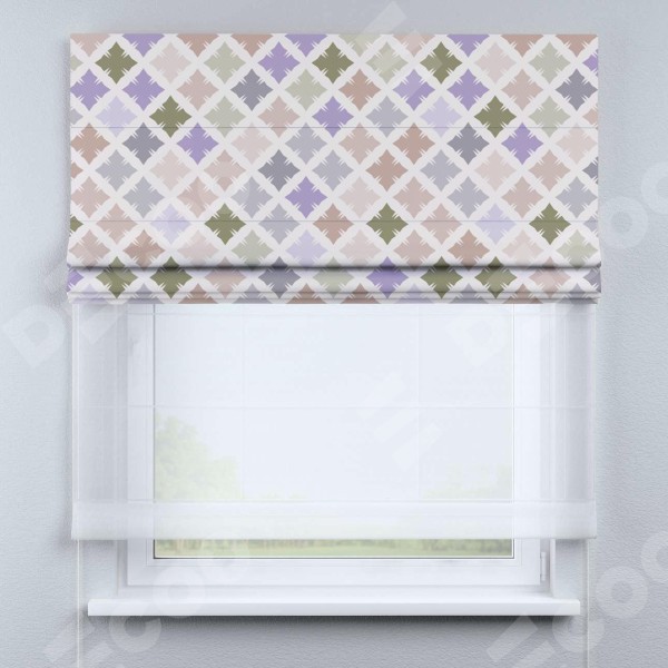 Римская штора день-ночь производителя «Cortin», используется для проёма, пошита из двух полотен, с лицевой блэкаут с нанесением сублимационной печати «Фигурные плитки», вторая ткань тюль (по стандарту комплектуется тюль белого цвета артикул V-01). Имеет универсальный механизм и подходит для монтажа: на потолок, на стену и в нишу.
