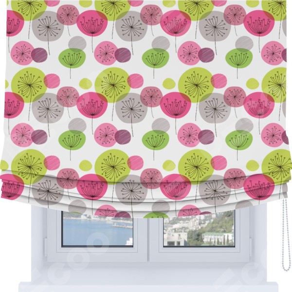 Римская штора Soft производителя «Cortin», используется для проёма, пошита из ткани блэкаут с нанесением сублимационной печати «Цветные одуванчики». Имеет универсальный механизм и подходит для монтажа: на потолок, на стену и в нишу. В отличие от стандартных римских штор, римская штора Soft не имеет горизонтальных вставок и нижнего отвеса. Это позволяет ткани произвольно драпироваться в свободные мягкие складки.