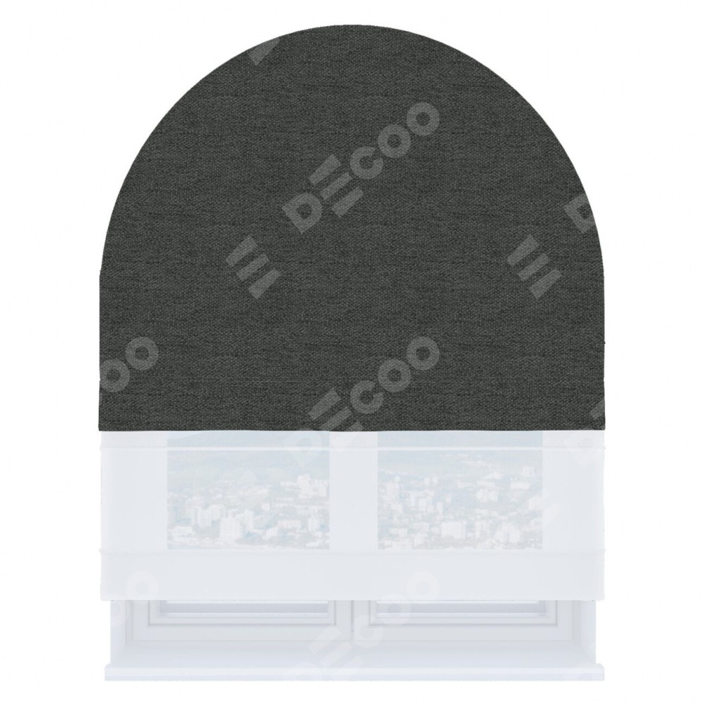Римская штора день-ночь производителя «Cortin», используется для арочного проёма, пошита из двух полотен, с лицевой стороны стиф димаут графит артикул 44026, вторая ткань тюль (по стандарту комплектуется тюль белого цвета артикул V-01). Штора шьётся по индивидуальным размерам, для данного типа римской шторы возможная ширина от 60 до 300 см. Удобное управление каждой шторой отдельно.