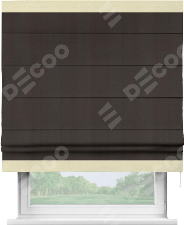 Римская штора производителя «Cortin», используется для проёма, пошита из ткани блэкаут однотонный венге, артикул ткани 88286. Отделка шторы кантом «Горизонт», ткань для канта используется из блэкаута однотонного разной расцветки на выбор. Имеет универсальный механизм и подходит для монтажа: на потолок, на стену и в нишу.