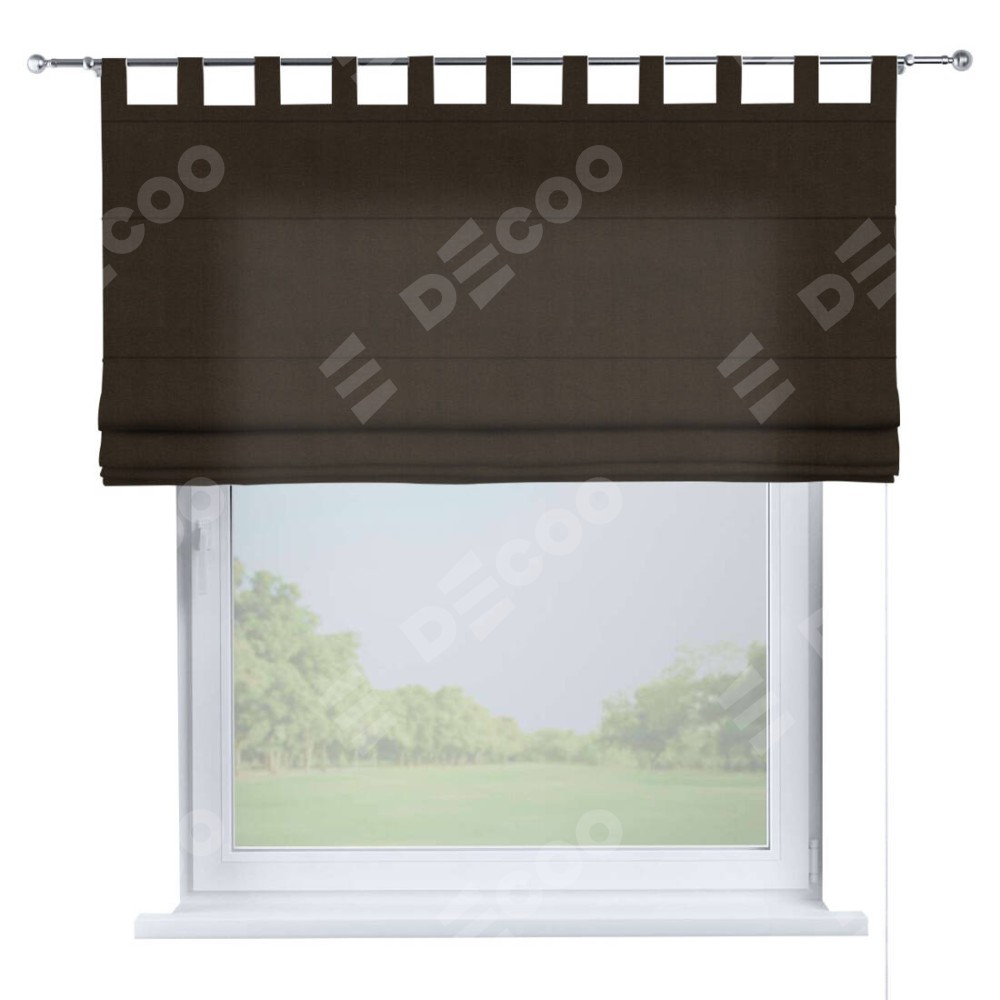 Римская штора производителя «Cortin», используется для проёма, пошита из ткани вельвет тёмно-коричневый, артикул ткани 30991. Данная модель пошита на петлях, комплектуется на выбор круглым карнизом и подходит для монтажа на стену. Римская штора на петлях имеет простую систему регулировки высоты, отличительным преимуществом данной модели является простой способ монтажа. Достаточно повесить ее на трубу и штора готова!