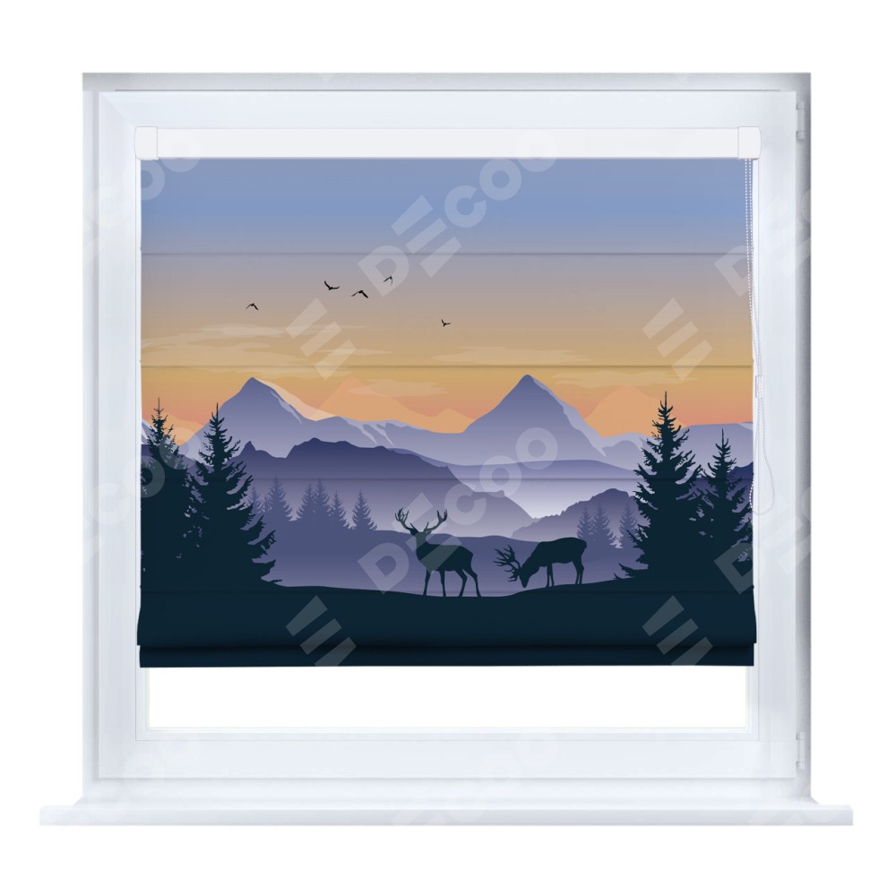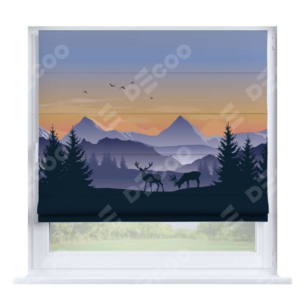 Римская штора производителя «Cortin», устанавливается на створку окна, пошита из ткани блэкаут с нанесением сублимационной печати «Закат в горах». Штора шьётся по индивидуальным размерам, для данного типа римской шторы возможная ширина от 35 до 150 см., высота до 250 см.