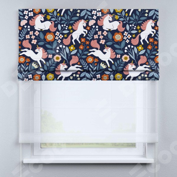 Римская штора день-ночь производителя «Cortin», используется для проёма, пошита из двух полотен, с лицевой блэкаут с нанесением сублимационной печати «Цветы и единороги», вторая ткань тюль (по стандарту комплектуется тюль белого цвета артикул V-01). Имеет универсальный механизм и подходит для монтажа: на потолок, на стену и в нишу.