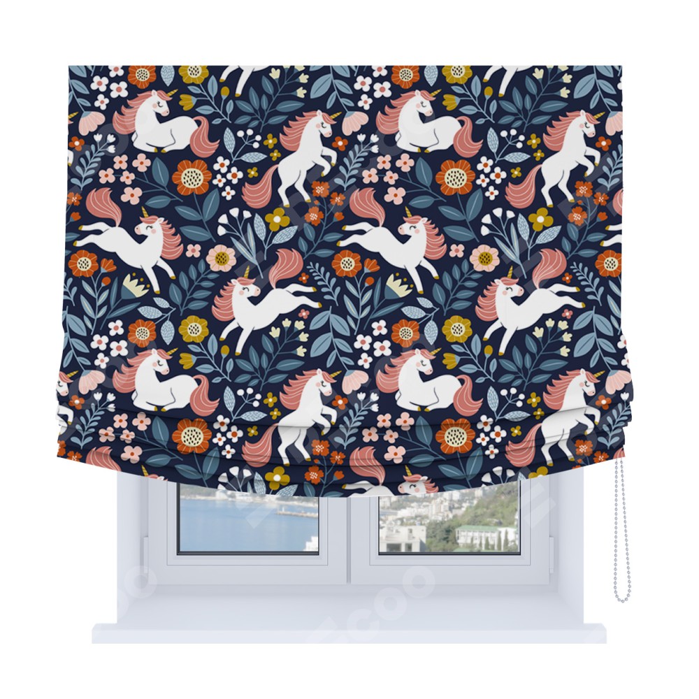 Римская штора Soft с мягкими складками, «Цветы и единороги»
