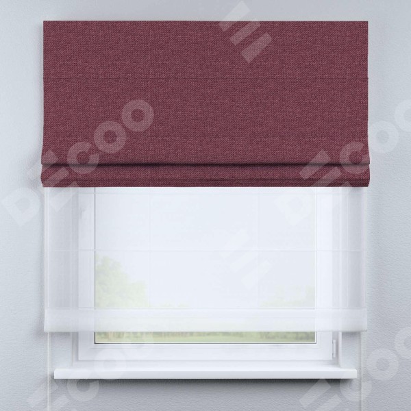Римская штора день-ночь производителя «Cortin», используется для проёма, пошита из двух полотен, с лицевой стороны лён димаут марсала артикул 1602, вторая ткань тюль (по стандарту комплектуется тюль белого цвета артикул V-01). Имеет универсальный механизм и подходит для монтажа: на потолок, на стену и в нишу.