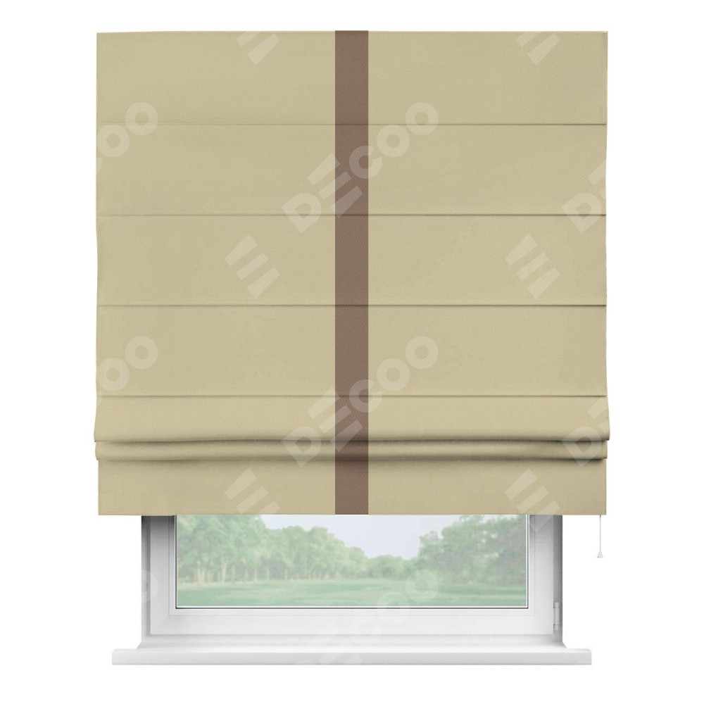 Римская штора производителя «Cortin», используется для проёма, пошита из ткани блэкаут однотонный кофейный, артикул ткани 13130. Отделка шторы кантом «Хайвей», ткань для канта используется из блэкаута однотонного разной расцветки на выбор. Имеет универсальный механизм и подходит для монтажа: на потолок, на стену и в нишу.
