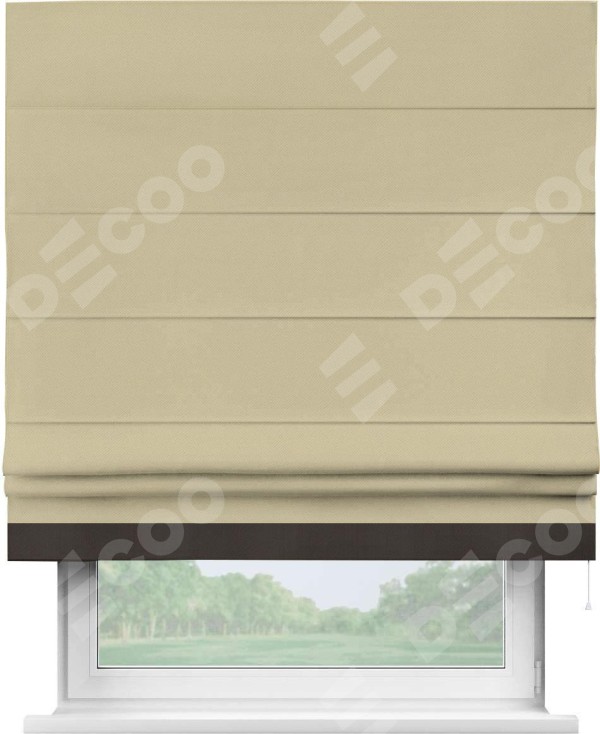 Римская штора производителя «Cortin», используется для проёма, пошита из ткани блэкаут однотонный кофейный, артикул ткани 13130. Отделка шторы кантом «Джестер», ткань для канта используется из блэкаута однотонного разной расцветки на выбор. Имеет универсальный механизм и подходит для монтажа: на потолок, на стену и в нишу.