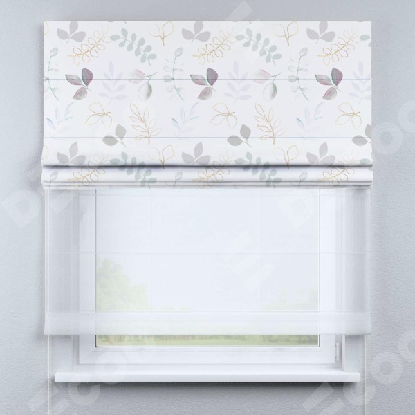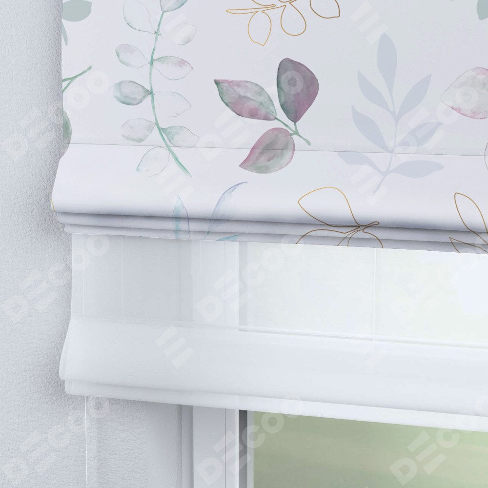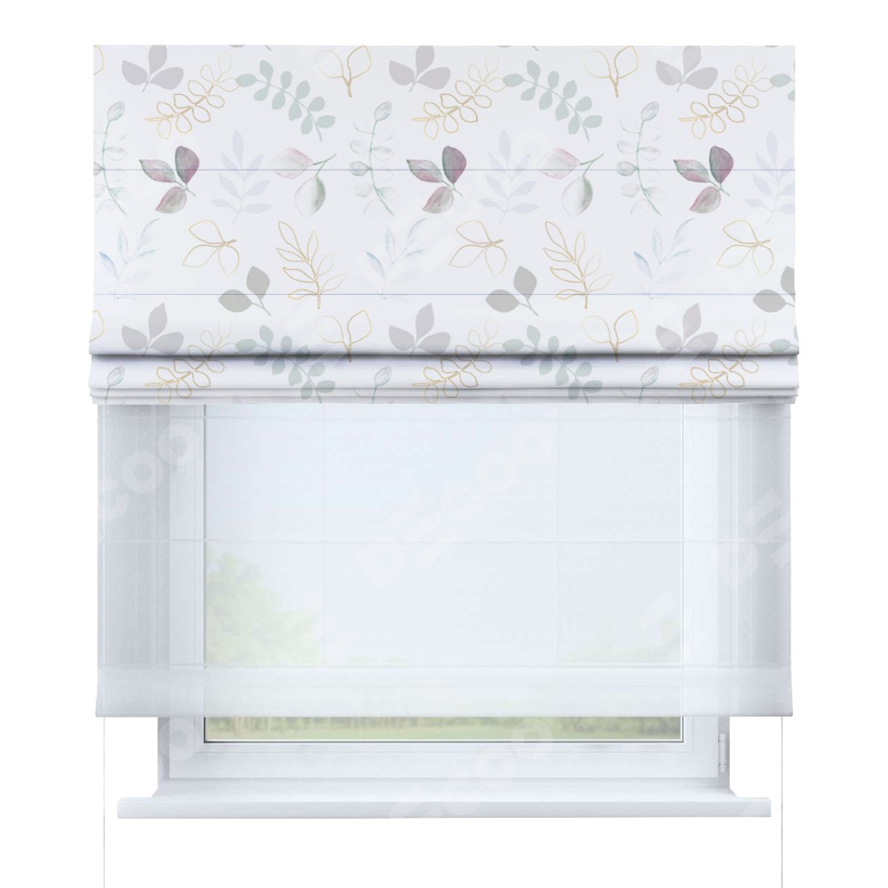 Римская штора день-ночь производителя «Cortin», используется для проёма, пошита из двух полотен, с лицевой блэкаут с нанесением сублимационной печати «Весенняя акварель», вторая ткань тюль (по стандарту комплектуется тюль белого цвета артикул V-01). Имеет универсальный механизм и подходит для монтажа: на потолок, на стену и в нишу.