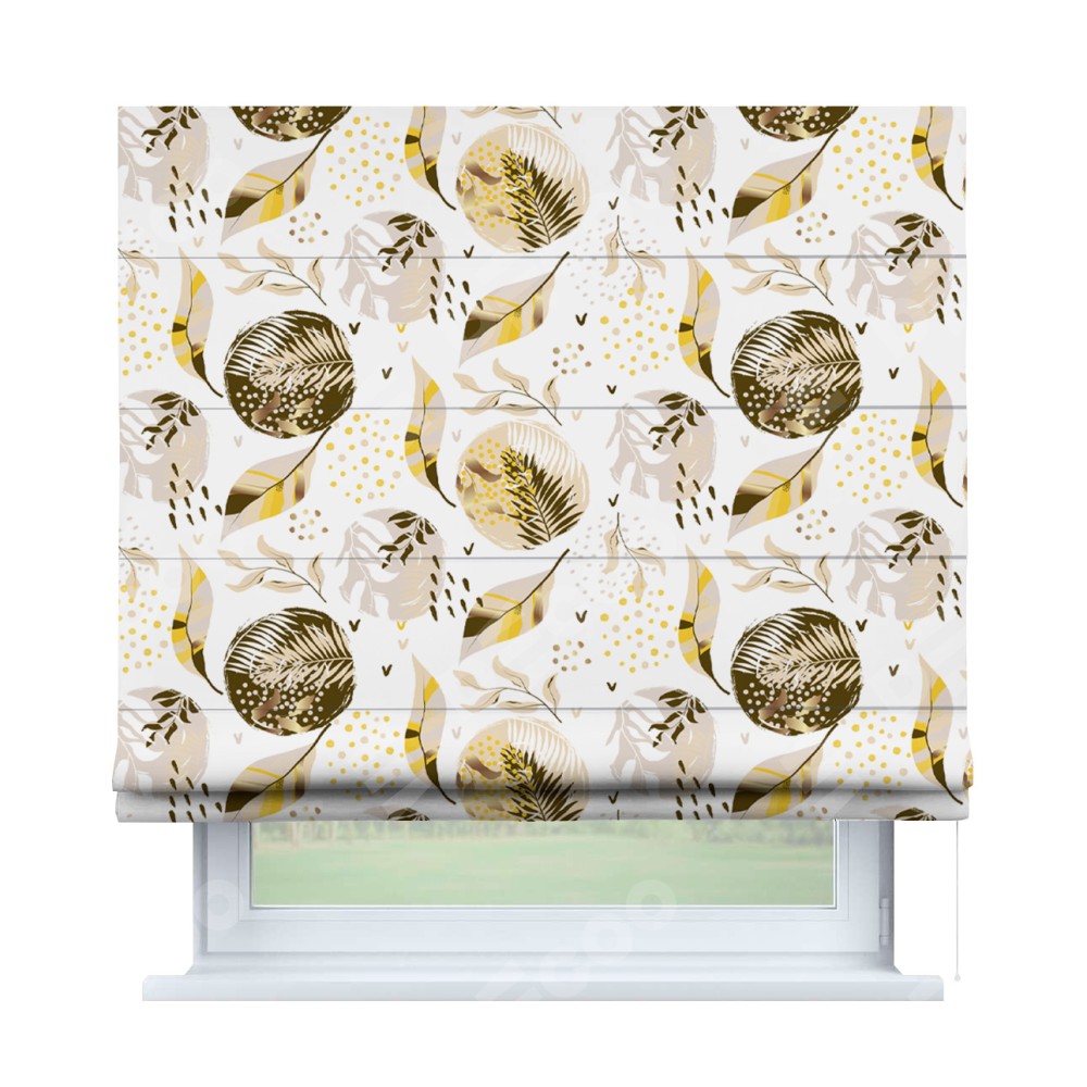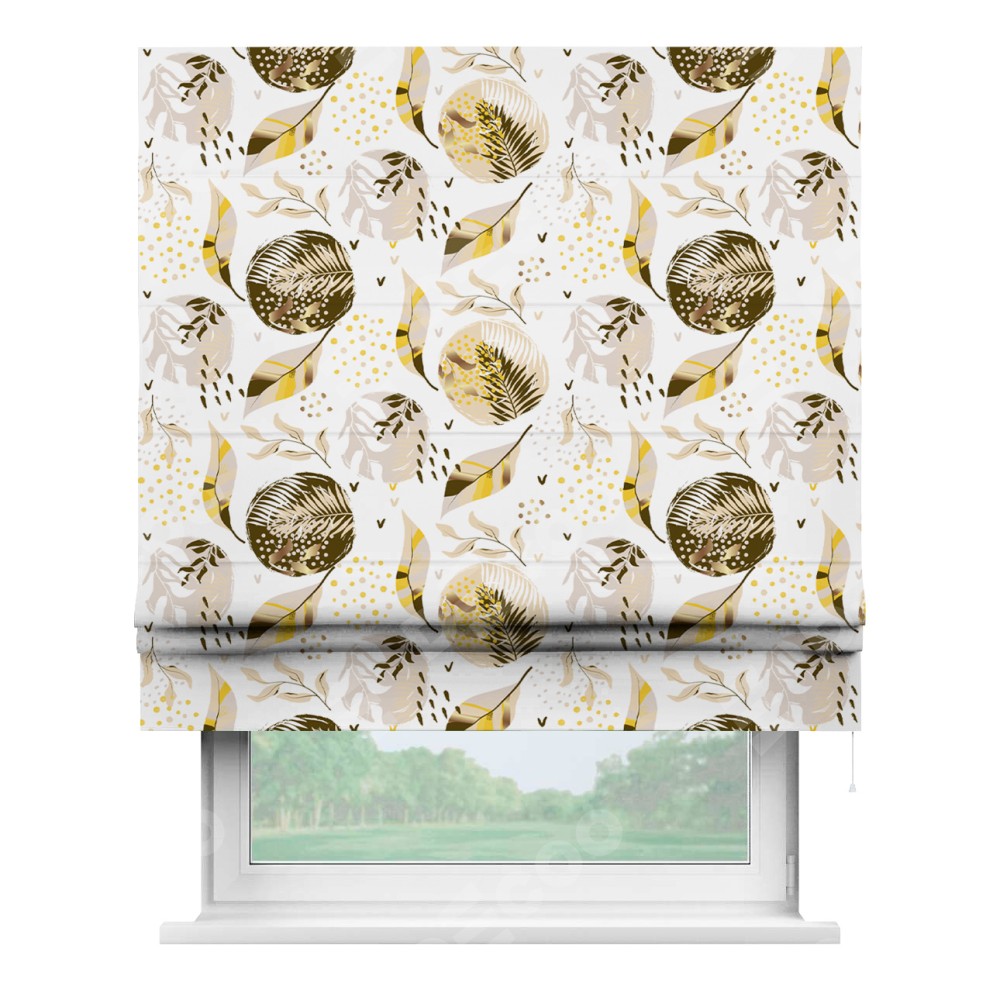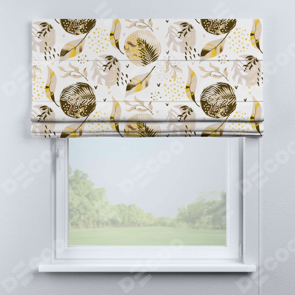 Римская штора производителя «Cortin», используется для проёма, пошита из ткани блэкаут с нанесением сублимационной печати «Золотые листья». Имеет универсальный механизм и подходит для монтажа: на потолок, на стену и в нишу.