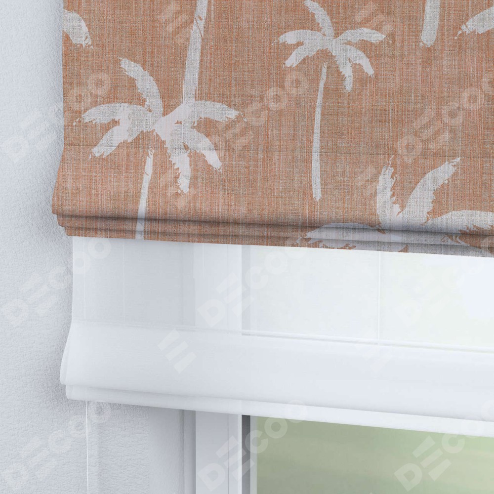 Римская штора день-ночь производителя «Cortin», используется для проёма, пошита из двух полотен, с лицевой блэкаут с нанесением сублимационной печати «Пальмы на закате», вторая ткань тюль (по стандарту комплектуется тюль белого цвета артикул V-01). Имеет универсальный механизм и подходит для монтажа: на потолок, на стену и в нишу.