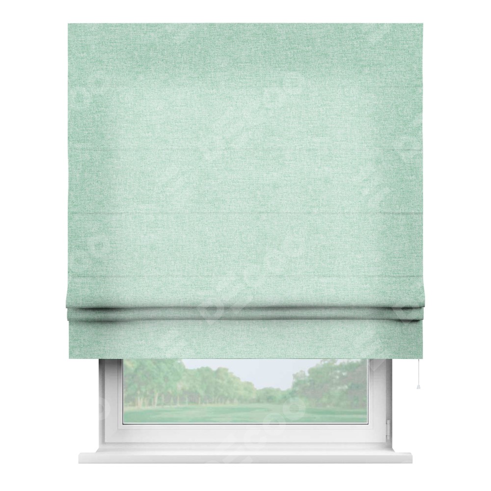 Римская штора производителя «Cortin», используется для проёма, пошита из ткани лён кашемир мятный, артикул ткани 21617. Имеет универсальный механизм и подходит для монтажа: на потолок, на стену и в нишу.