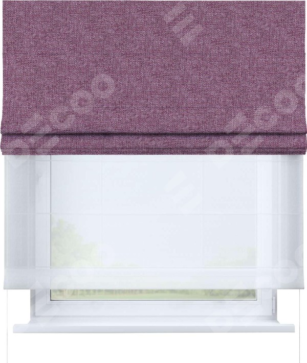 Римская штора день-ночь производителя «Cortin», используется для проёма, пошита из двух полотен, с лицевой стороны лён кашемир сиреневый артикул 21620, вторая ткань тюль (по стандарту комплектуется тюль белого цвета артикул V-01). Имеет универсальный механизм и подходит для монтажа: на потолок, на стену и в нишу.