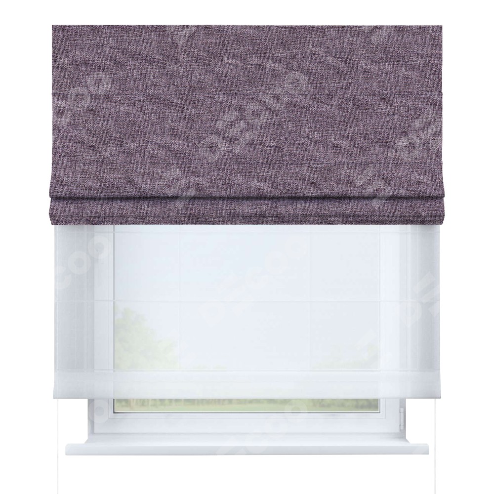 Римская штора день-ночь производителя «Cortin», используется для проёма, пошита из двух полотен, с лицевой стороны лён кашемир фиолетовый артикул 17211, вторая ткань тюль (по стандарту комплектуется тюль белого цвета артикул V-01). Имеет универсальный механизм и подходит для монтажа: на потолок, на стену и в нишу.