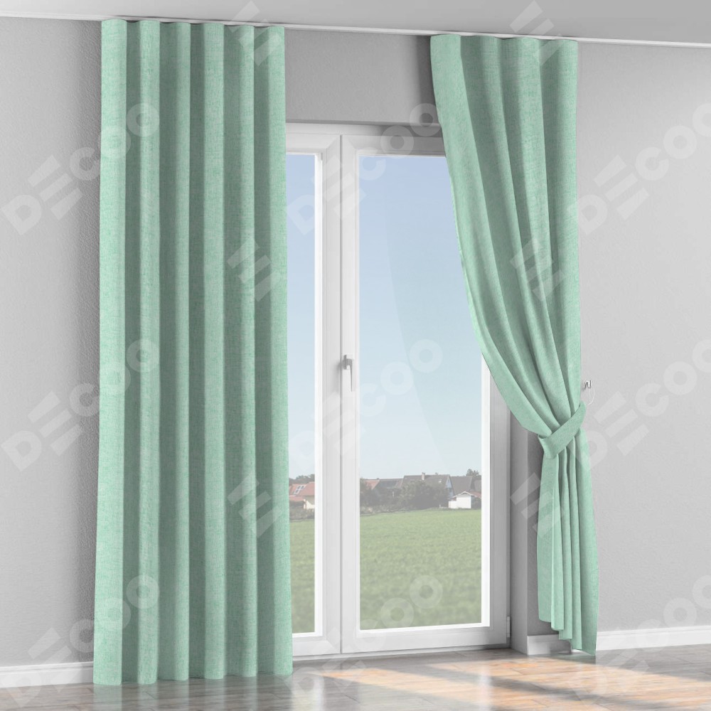Комплект прямых штор, от производителя «Cortin», пошиты из ткани лён кашемир мятный, артикул ткани 21617. С изнаночной стороны в верхней части штор пристрачивается шторная лента с декоративными складками «Волна». Для создания элегантных складок прямые шторы шьются по стандарту с коэффициентом 1:2 (на 100 см. ширины проёма 200 см. ширины ткани).