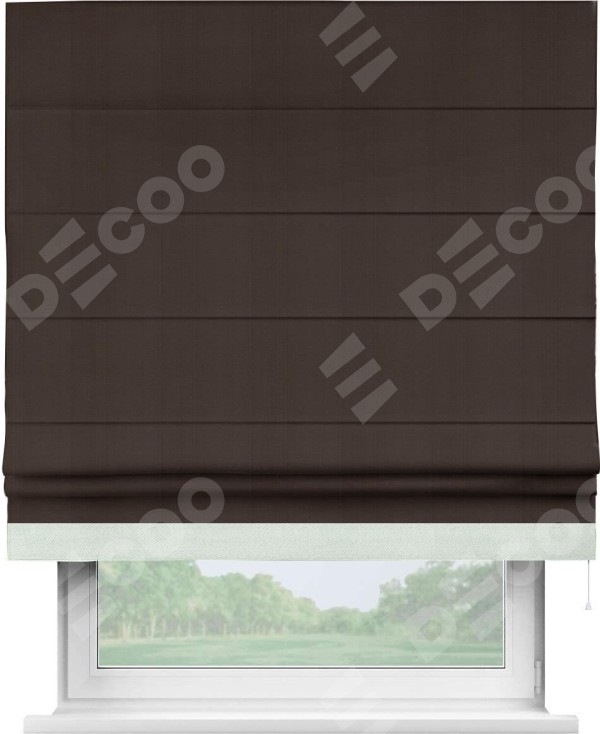 Римская штора производителя «Cortin», используется для проёма, пошита из ткани блэкаут однотонный тёмно-коричневый, артикул ткани 88287. Отделка шторы кантом «Джестер», ткань для канта используется из блэкаута однотонного разной расцветки на выбор. Имеет универсальный механизм и подходит для монтажа: на потолок, на стену и в нишу.