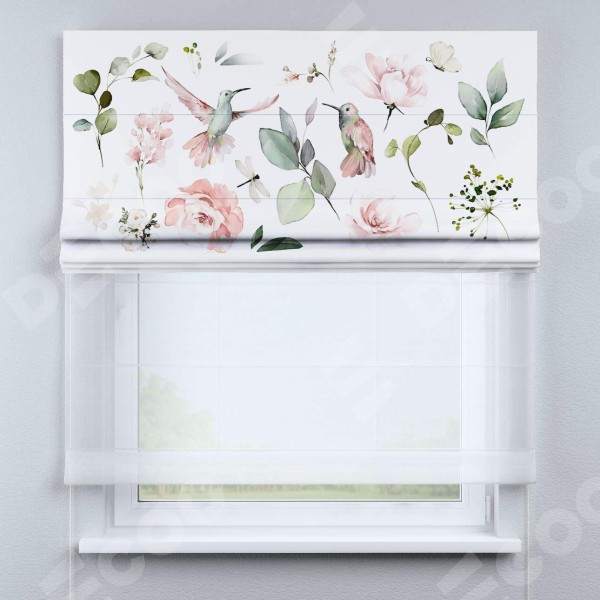 Римская штора день-ночь производителя «Cortin», используется для проёма, пошита из двух полотен, с лицевой блэкаут с нанесением сублимационной печати «Уютный сад», вторая ткань тюль (по стандарту комплектуется тюль белого цвета артикул V-01). Имеет универсальный механизм и подходит для монтажа: на потолок, на стену и в нишу.