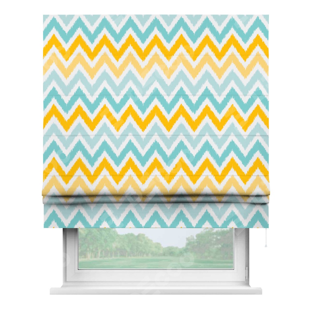 Римская штора производителя «Cortin», используется для проёма, пошита из ткани блэкаут с нанесением сублимационной печати «Икат шеврон». Имеет универсальный механизм и подходит для монтажа: на потолок, на стену и в нишу.