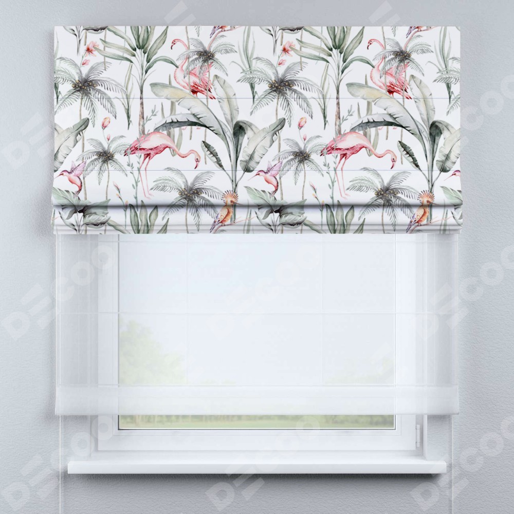 Римская штора день-ночь производителя «Cortin», используется для проёма, пошита из двух полотен, с лицевой блэкаут с нанесением сублимационной печати «Изящные фламинго», вторая ткань тюль (по стандарту комплектуется тюль белого цвета артикул V-01). Имеет универсальный механизм и подходит для монтажа: на потолок, на стену и в нишу.