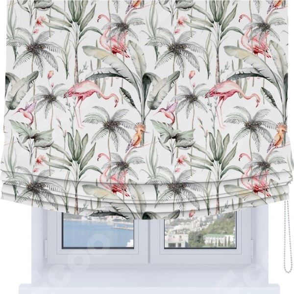 Римская штора Soft производителя «Cortin», используется для проёма, пошита из ткани блэкаут с нанесением сублимационной печати «Изящные фламинго». Имеет универсальный механизм и подходит для монтажа: на потолок, на стену и в нишу. В отличие от стандартных римских штор, римская штора Soft не имеет горизонтальных вставок и нижнего отвеса. Это позволяет ткани произвольно драпироваться в свободные мягкие складки.
