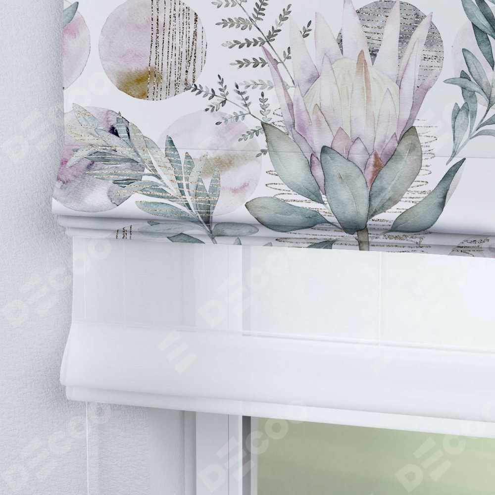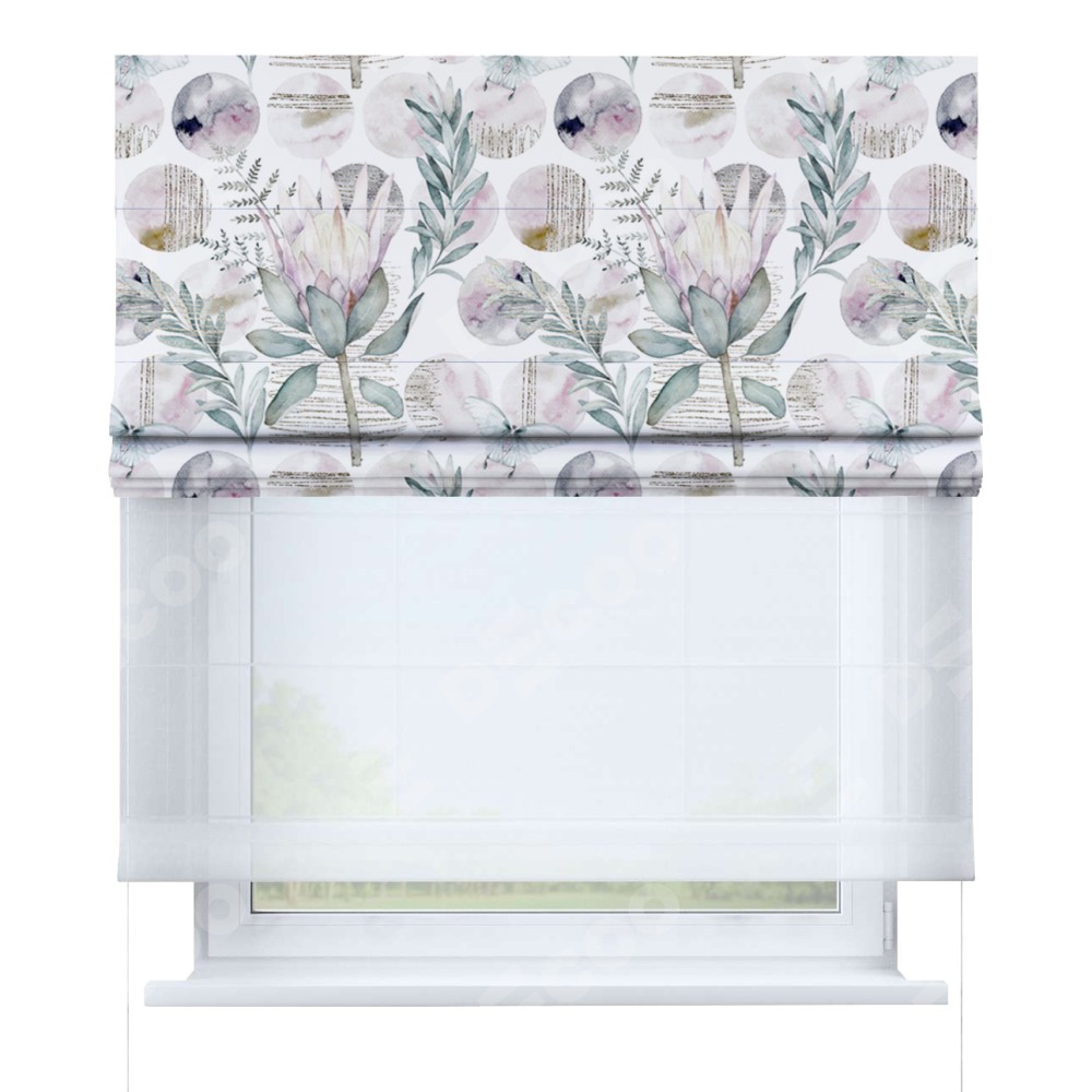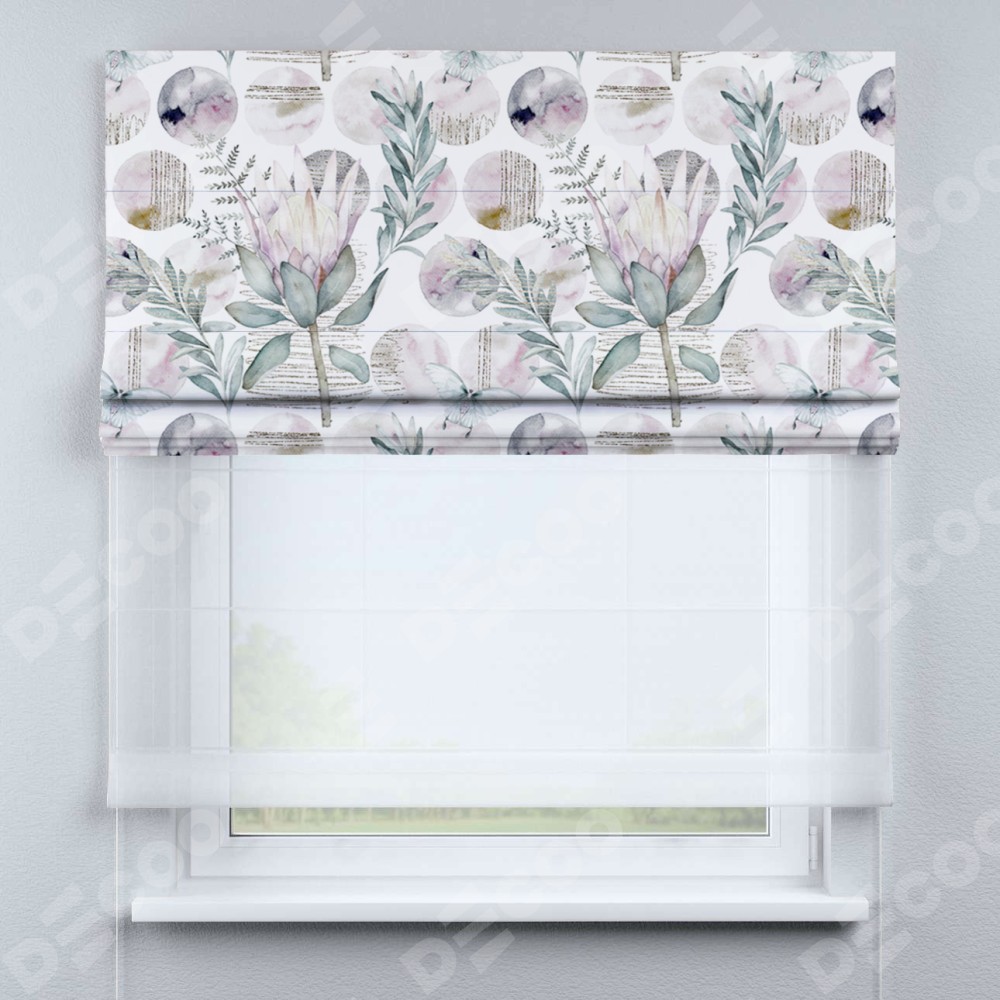 Римская штора день-ночь производителя «Cortin», используется для проёма, пошита из двух полотен, с лицевой блэкаут с нанесением сублимационной печати «Розовый лотос», вторая ткань тюль (по стандарту комплектуется тюль белого цвета артикул V-01). Имеет универсальный механизм и подходит для монтажа: на потолок, на стену и в нишу.