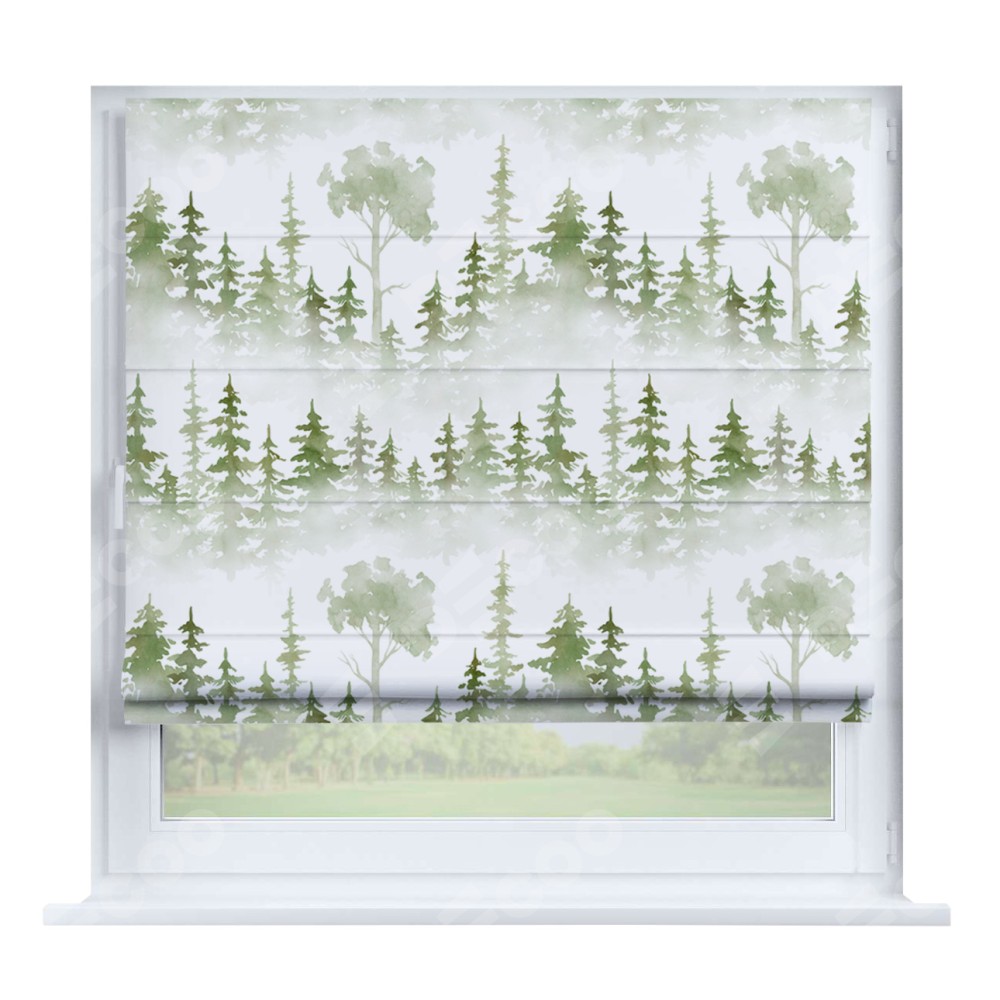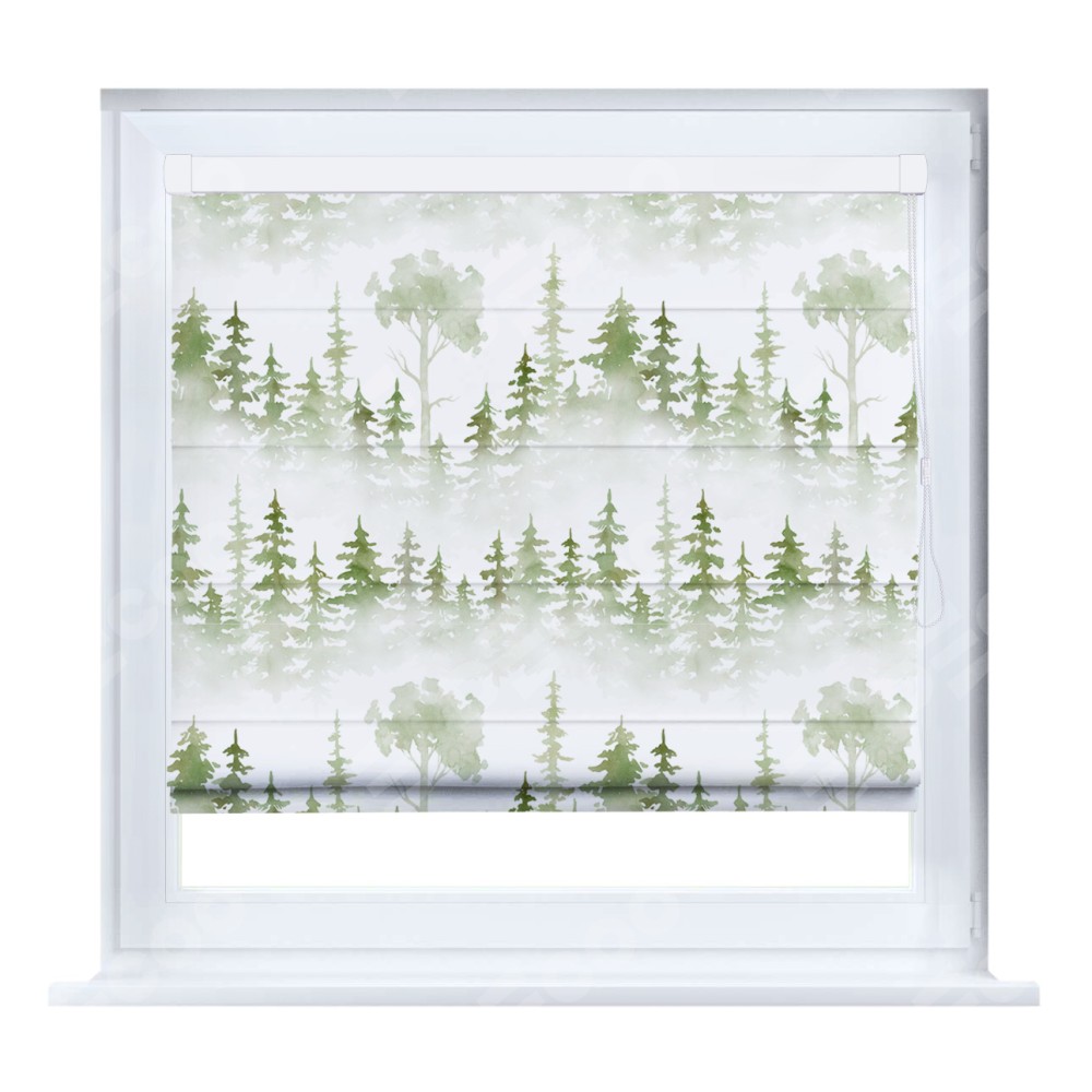 Римская штора производителя «Cortin», устанавливается на створку окна, пошита из ткани блэкаут с нанесением сублимационной печати «Туманный лес». Штора шьётся по индивидуальным размерам, для данного типа римской шторы возможная ширина от 35 до 150 см., высота до 250 см.