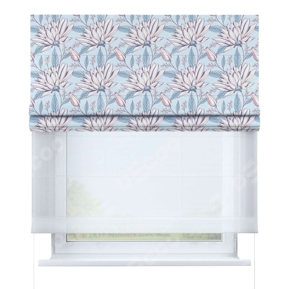 Римская штора день-ночь производителя «Cortin», используется для проёма, пошита из двух полотен, с лицевой блэкаут с нанесением сублимационной печати «Романтическое утро», вторая ткань тюль (по стандарту комплектуется тюль белого цвета артикул V-01). Имеет универсальный механизм и подходит для монтажа: на потолок, на стену и в нишу.