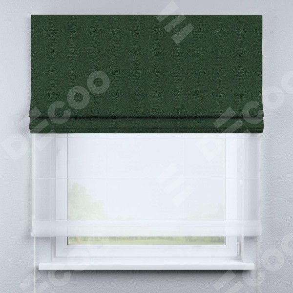 Римская штора день-ночь производителя «Cortin», используется для проёма, пошита из двух полотен, с лицевой стороны лён блэкаут зелёный артикул 69497, вторая ткань тюль (по стандарту комплектуется тюль белого цвета артикул V-01). Имеет универсальный механизм и подходит для монтажа: на потолок, на стену и в нишу.