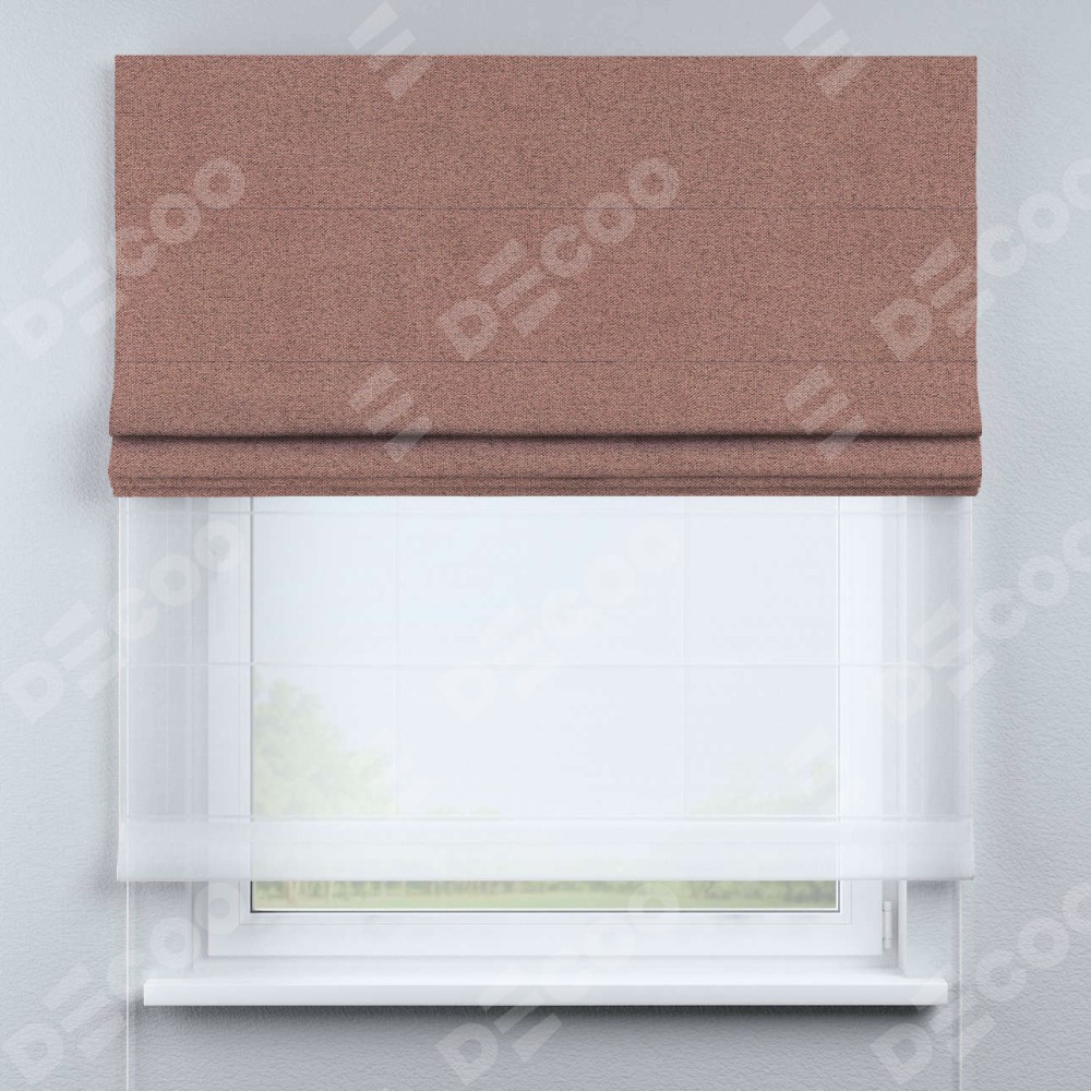 Римская штора день-ночь производителя «Cortin», используется для проёма, пошита из двух полотен, с лицевой стороны лён блэкаут розовый артикул 69575, вторая ткань тюль (по стандарту комплектуется тюль белого цвета артикул V-01). Имеет универсальный механизм и подходит для монтажа: на потолок, на стену и в нишу.