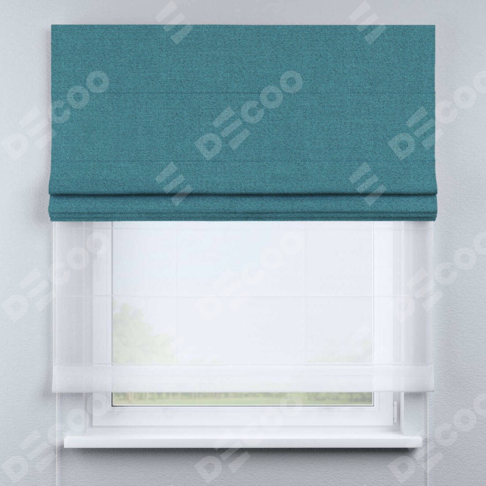 Римская штора день-ночь производителя «Cortin», используется для проёма, пошита из двух полотен, с лицевой стороны лён блэкаут синий артикул 69528, вторая ткань тюль (по стандарту комплектуется тюль белого цвета артикул V-01). Имеет универсальный механизм и подходит для монтажа: на потолок, на стену и в нишу.