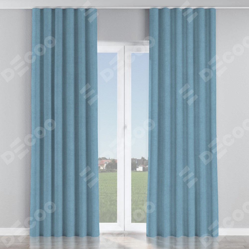 Комплект прямых штор, от производителя «Cortin», пошиты из ткани лён блэкаут голубой, артикул ткани 69574. С изнаночной стороны в верхней части штор пристрачивается шторная лента с декоративными складками «Волна». Для создания элегантных складок прямые шторы шьются по стандарту с коэффициентом 1:2 (на 100 см. ширины проёма 200 см. ширины ткани).