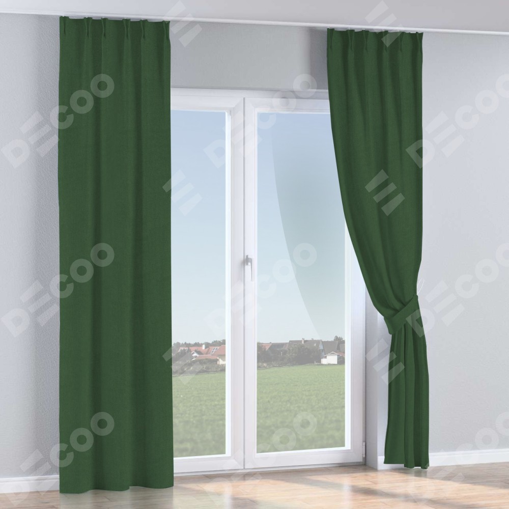 Комплект прямых штор, от производителя «Cortin», пошиты из ткани лён блэкаут зелёный, артикул ткани 69497. С изнаночной стороны в верхней части штор пристрачивается шторная лента с декоративными складками «Кустик». Для создания элегантных складок прямые шторы шьются по стандарту с коэффициентом 1:2 (на 100 см. ширины проёма 200 см. ширины ткани).